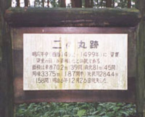 烏山城二ノ丸の説明板 戦国時代の那須氏が居城とした城。 那須氏の出自は詳しく判っていないが、古代那須国造の末裔とも、藤原道長の流れともいわれている。伝説では、那須国造の家系に中央から下った道長の曾孫貞信が娘婿として入ったとされ、那須の藤原と…