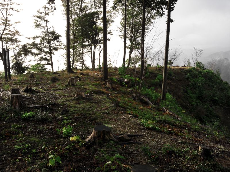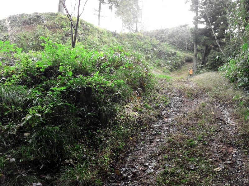 二ノ丸は、三日月型の主郭を含め5段構成で、高梁川沿いに北東へ伸びる街道の眺めが良く、説明板にある通り街道を使うであろう尼子軍への監視機能があったのだろう。二ノ丸から三ノ丸へはやや下がり、細長い郭とその前後にそれぞれ一条の堀切が穿たれているが、周辺は一部藪化していて、足元に注意が必要だ。