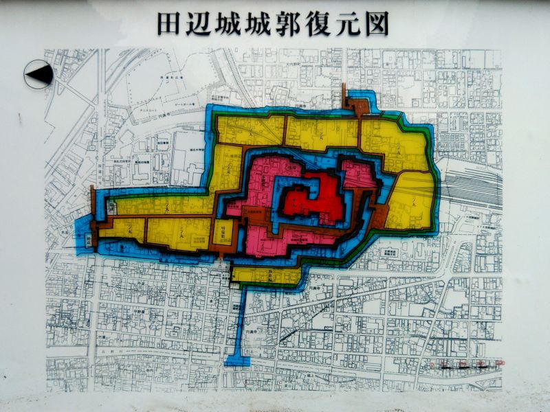 城の縄張は、藤孝の築城後、江戸時代に京極氏と牧野氏によって改修が加えられ、最終的には長方形に近い本丸を二ノ丸、三ノ丸、外郭の各郭と二重の堀が囲む形となっているが、本丸と二ノ丸に掛けての動線は渦郭式の構造である。明治6年(1873)の廃城令で廃城となった後は、翌年から建物が取り壊され、現在は本丸と二ノ丸の一部が公園として残っているのだが、それ以外の城地は、市街化による改変も進んでおり、城の全体像は非常に掴みづらい。
