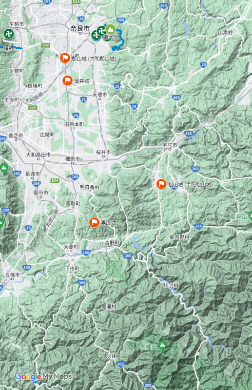 奈良県は、お城が5城に観光地が2ヶ所、寺社が4ヶ所、史跡が1ヶ所、自然が1ヶ所、道路橋梁が、大阪でもカウントした暗峠を含め2本の、計15スポット。