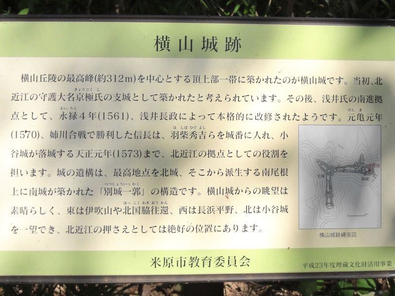 横山城が史料に登場するのは16世紀初頭で、永正14年(1517)に浅井亮政と京極高清が対立した際、亮政が城を落としたとあり、この頃には既に存在したようだ。その後、亮政台頭の過程で、京極氏や南近江の守護六角氏を巻き込んだ戦いがあり、横山城も浅井氏や六角氏によって境目の軍事拠点として利用され、幾度も改修の手が入ったと考えられる。