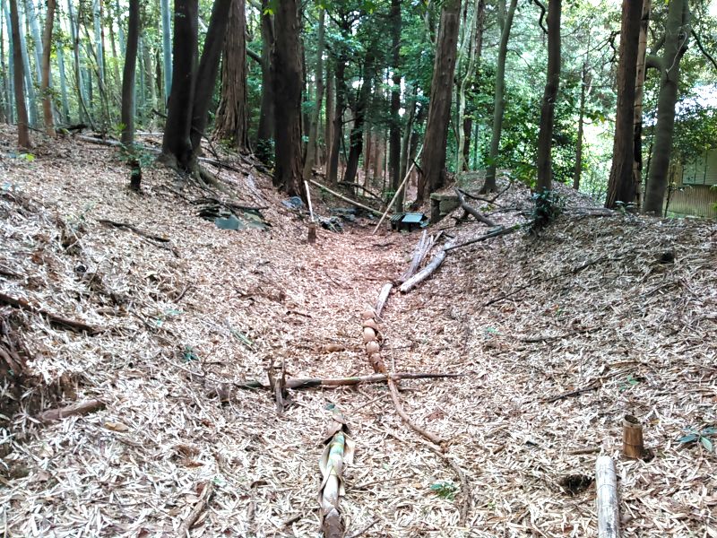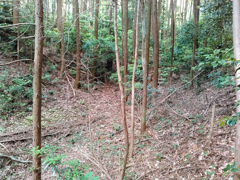 松原寺から山へと入っていくと、すぐ巨大な土塁が目に入り、その向こう側は大きな空堀となっていた。これが城を二分するほどの大空堀なのだが、本丸側は鮮明で深く、北東側は浅く不鮮明となっている。谷のような地形であるが故、長年の堆積で浅くなってしまったのだろうが、巨大なだけに非常に惜しいところだ。城全体のイメージとしては、全体的に城内が緩やかで、整った方形に近い郭が多く、城というよりは屋敷地という感じの穏やかさがある。また、竹がや杉が中心で下草が少なく、楽に散策できる城でもあった。