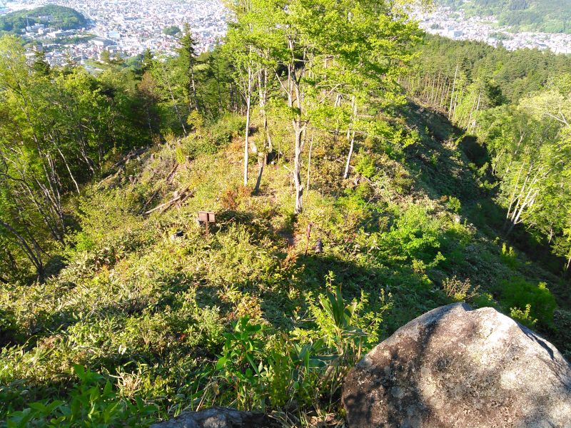 最も広い稜線がある北東方向は、大きな堀切で断ち切り、その先にも石垣造ではない郭を設けていたようだ。ちなみに、城下や家臣の屋敷は北麓に営まれていた為、この北東の稜線近辺が大手になると思われる。
