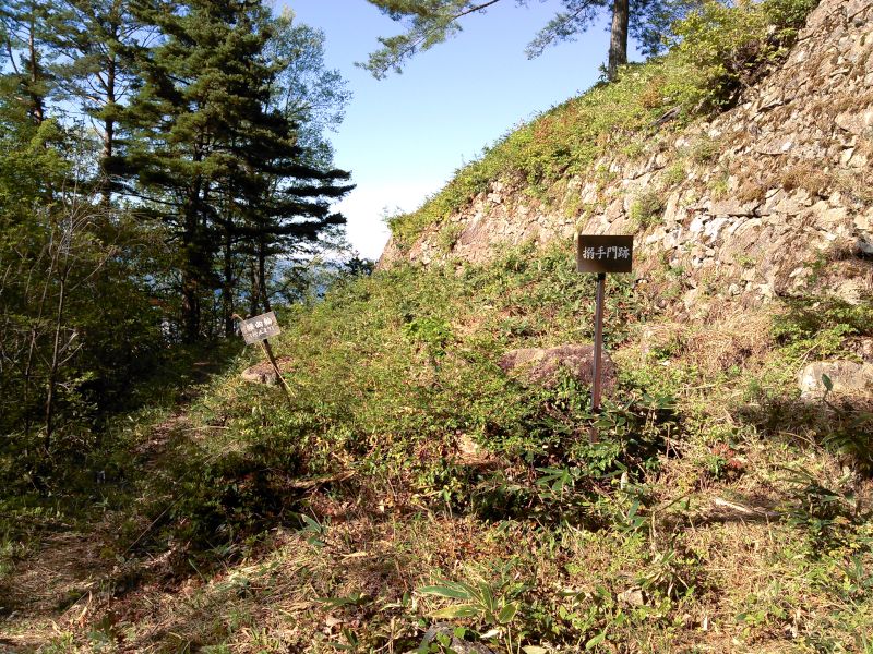 現地を訪れてみると、車道が城のすぐ近くまで通されており、峻険な山城にしては非常に楽に訪れることができる城だった。車道から主郭部方向へ歩くと、三ノ丸へ着くまでに2筋の堀切があり、細長い削平地もあることから、往時は城域の一部だったのだろう。三ノ丸の石垣の脇を通って主郭部に入ろうとすると、西端に櫓台を持つ三ノ丸が想像以上の圧迫感を持っており、攻撃されればひとたまりもない印象である。その張り出した部分の東に長方形の二ノ丸が続き、二ノ丸の東端にも空堀があった。