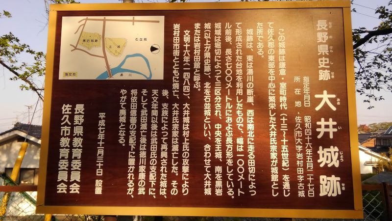 大井氏は、小笠原氏の庶流で、佐久郡大井荘を本貫として勢力を拡げた豪族だが、大井荘の開発領主ではなく、承久3年(1221)の承久の乱の功で新たに入部した新補地頭である。その入部の際、この大井城が築かれたという。