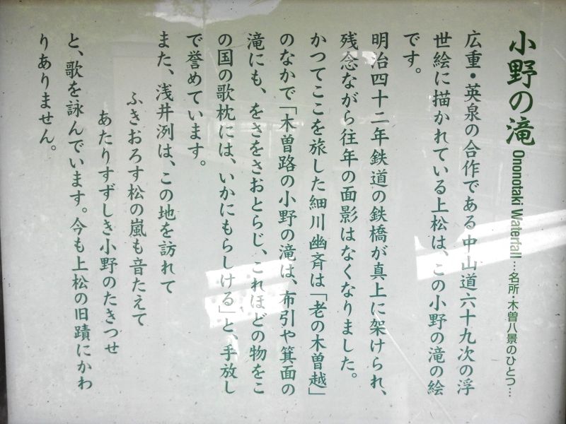 木曽八景のひとつ「小野ノ瀑布」で知られる滝。地図上では小野ノ滝とあり、現地は小野の滝という表記で、仮名が違っていた。少し表記の揺れがあるようだ。