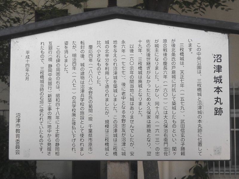 現地には、沼津城址碑しか建っていないが、沼津城は三枚橋城の跡地を利用したもので、三枚橋城が前身と言える。ただ、2つの城の存在期間はかなり離れており、直接の前身と言うのは難しいかもしれない。ちなみに、三枚橋城を沼津古城と呼ぶ場合もあるようだ。