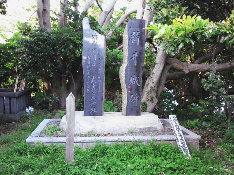 新井城の城址碑は、旧油壷マリンパーク駐車場の北側、道寸の墓の近くにあり、城の遺構としては、荒井浜海水浴場方向への遊歩道から東大地殻変動観測所内の空堀をはっきり確認することができる。だが、開発による消失や立入禁止などで、城の痕跡を数えるほどしか確認することができなかったのは残念だった。度重なる地震でも地形はかなり変わっているらしく、現地から当時の姿を思い浮かべるのが、なかなか難しい城である。