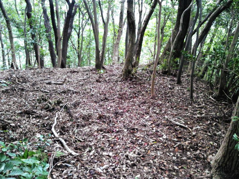 登り始めるとすぐに観音堂のある削平地に出るが、ここも城域だったと思われるものの、出郭のような位置付けだったのか、この先には遺構が少なく、連続性が無い。観音堂を過ぎるとしばらく尾根道が続き、鞍部か土橋か判別できない箇所を過ぎるとようやく段郭が現れ、土塁や堀切、食い違い虎口状の地形が見られるようになり、ぐっと城跡らしくなる。ただ、段郭はどれも規模が小さく、急峻な小城という印象だ。