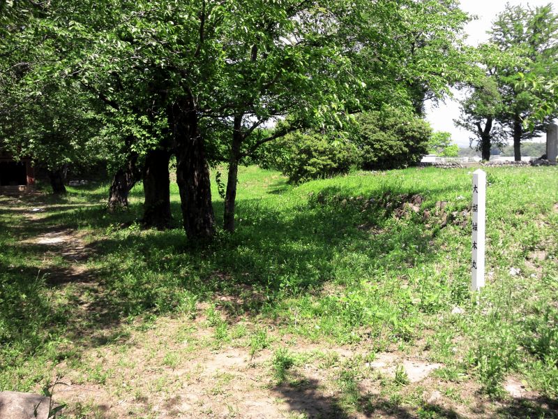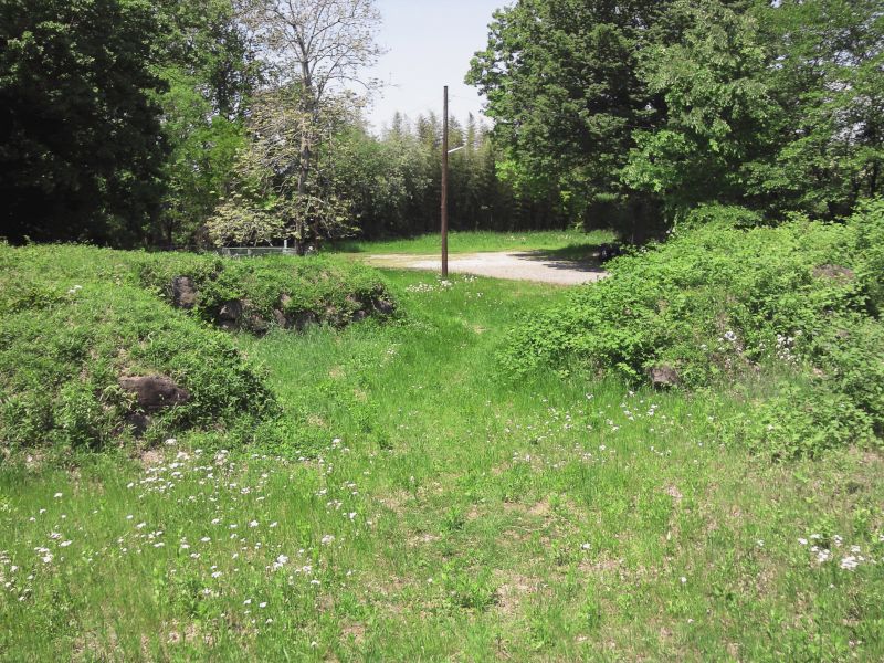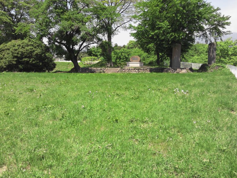 大胡市街を流れる荒砥川沿いの県道に、城への小さな案内表示があり、曲がるとすぐに大胡城の城域である。駐車場となっている二ノ丸からは、本丸の空堀や二ノ丸の桝形が見え、心地よい春の風が新緑を撫でていた。