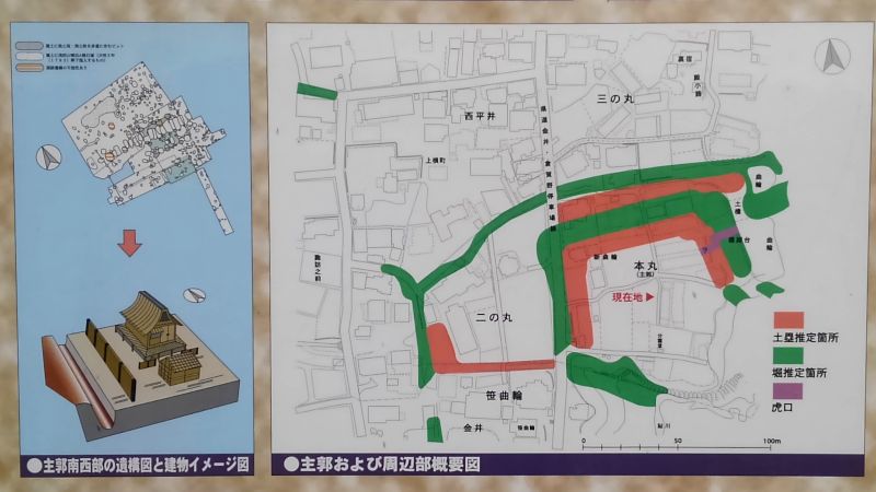 総郭の規模は大きく、ここには重臣などの武家屋敷や城下町が置かれたのだろう。城の西の外縁には、庚申(荒神)堀が廻らされ、鮎川と共に惣構の機能を担い、今の西平井公会堂付近に追手門があったようだ。