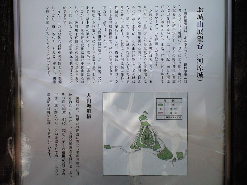 秀吉がこの城に陣を置いたという、1回目の因幡攻略戦を追うと、隣国但馬から弟秀長の軍を侵攻させて鳥取城を攻囲すると共に、自らは姫路から侵攻し、若桜鬼ヶ城、私都城を落城させて秀長軍に合流したといい、丸山城に長期間滞在したとは考えにくい。だが、展望台建設に先だって平成3年(1991)から行われた全面発掘調査では、多くの郭と共に柱穴や堀切が確認されており、出城であったいわれる城ではあるが、それ以前から恒久的な建物はあったようだ。
