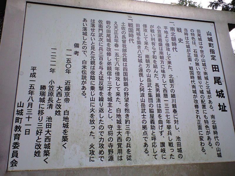 南北朝時代初期の阿波奥部では、南朝方の小笠原義盛が大西城を本拠としていたが、その子か従兄弟といわれる頼清が、讃岐の脇屋義助と呼応して建武4年(1337)に築いたのが、田尾城の最初という。