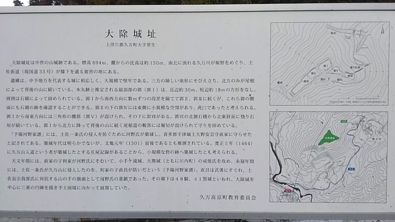 大除城の築城年代は不明だが、愛媛県史では、久万山に跋扈した久万出雲入道を大野通繁・綱直兄弟が平定した、寛正5年(1464)前後と推測しており、この久万入道が築城したとの庄屋記録があるという。
