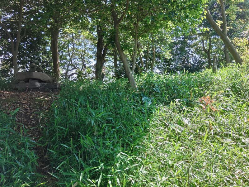 錘型の山は、西側が最高部で主郭となるが、北東方向に中十神、小十神という2つの小ピークを持っており、それぞれ出丸のような郭が築かれていた。とは言え、大きな工事は行われていなかったようで、頂上部は二重の方形に削平されているのみであり、主郭部から延びる峰筋に小さな段郭が続く縄張は、中世的な趣が強い。また、南東方向の谷筋を作る2筋の峰の段郭は重層的で、現在の向陽寺方向に居館の存在が推定されているようだ。