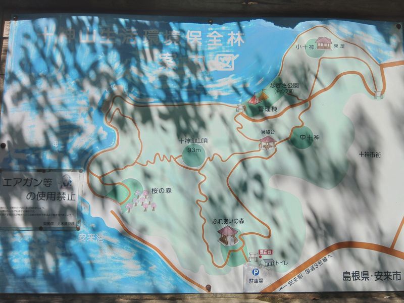現在の城跡は、公園化されて遊歩道が整備されており、十神山から中十神、小十神を歩き回ることが可能だが、十神山山頂の遺構以外は不明瞭で、縄張が追いにくい城だった。また、中海への眺望が開ける場所も少なく、爽快感には欠けるのだが、山中の遊歩道は程々に疲れる程度の負荷で、史跡を散歩すると考えると、ちょうど良い城だった。